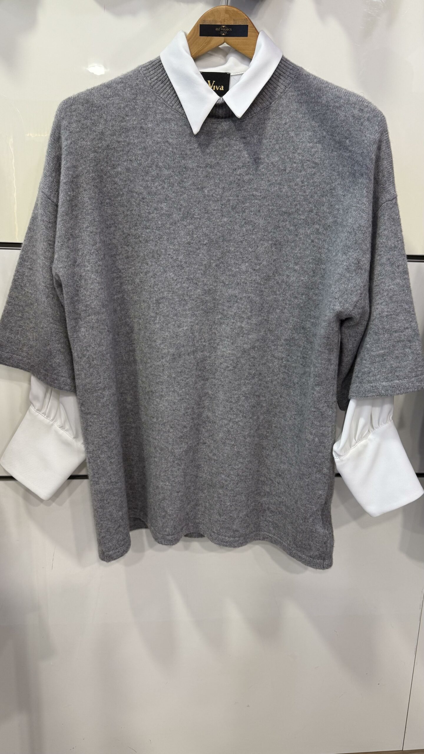 Pilkas kašmyro megztinis – tylusis garderobo herojus (parduodamas tik megztukas, be baltų marškinių-juos pirkti galima atskirai).