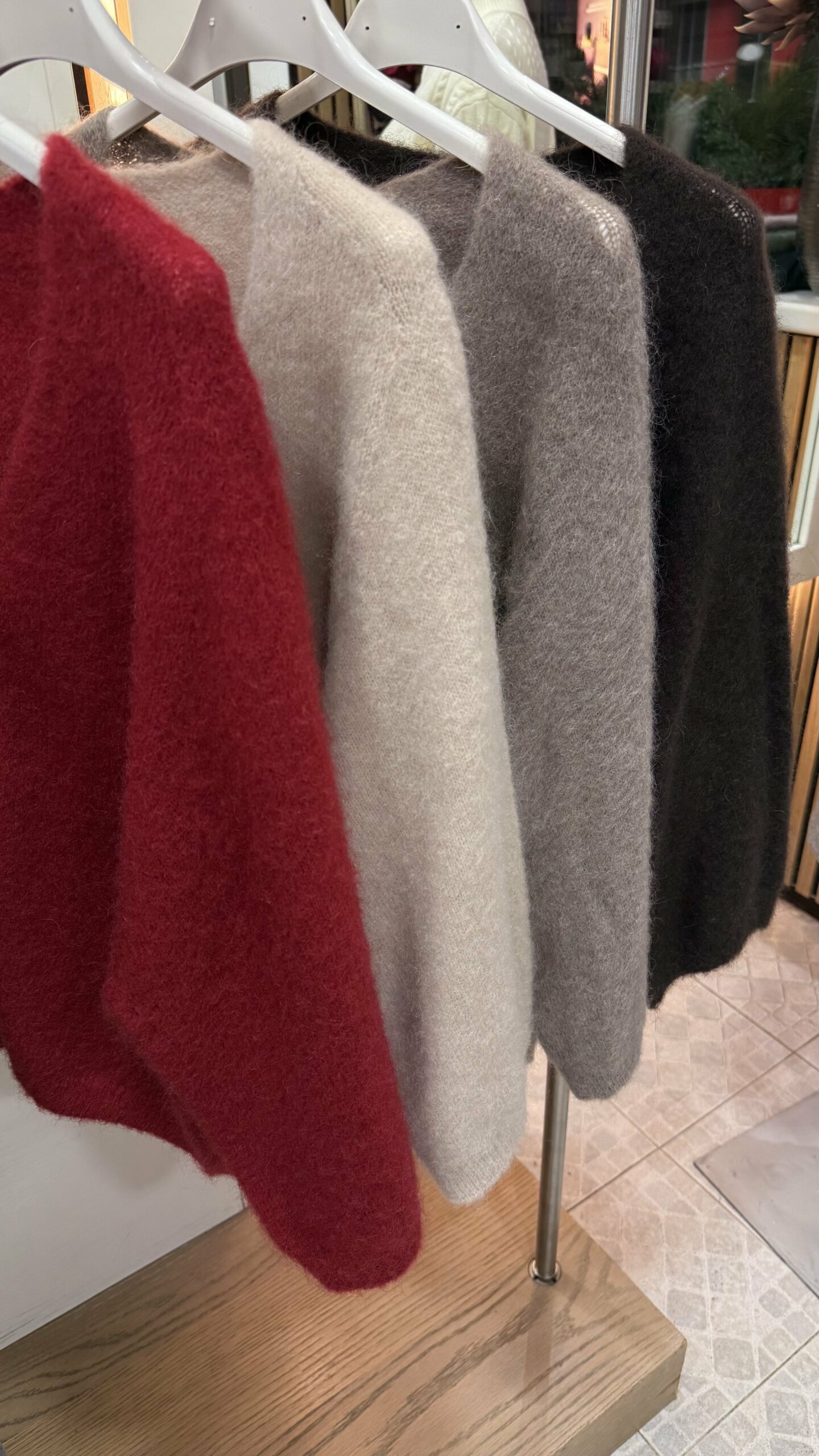 Itin švelnus ir lengvai pūkuotas moheros megztukas su trimis blizgiomis sagutėmis — tikras jaukumo ir subtilios elegancijos derinys. Modelis lengvai krentantis, su gilia V formos iškirpte, puikiai tinkantis tiek prie kelnių, tiek prie sijonų.
